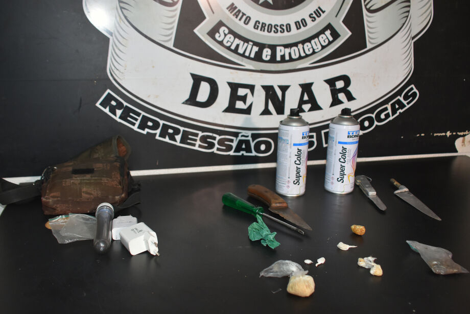 A apreensão, conforme registrado em imagens, inclui pequenos papelotes, cuja quantidade não foi precisada, além de armas brancas, duas facas, um canivete, uma chave de fenda, e duas latas de spray de tinta.