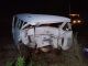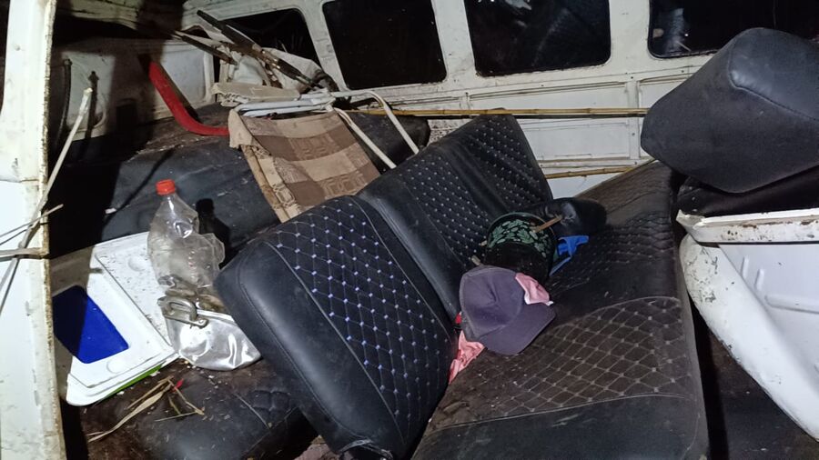 A parte frontal da caminhonete ficou destruída, com amassos e avarias. A parte traseira da Kombi virou uma “bola de papel”.