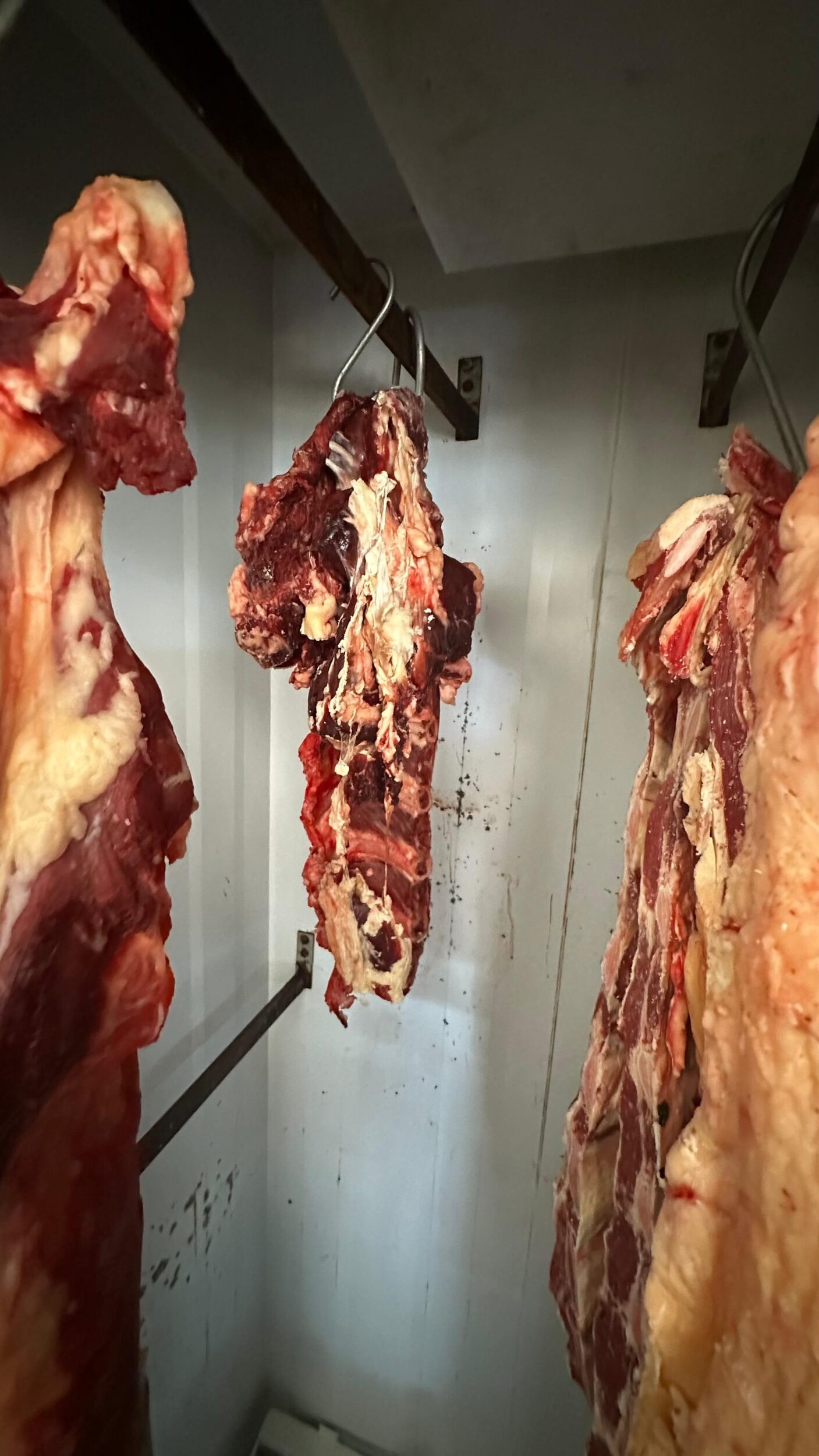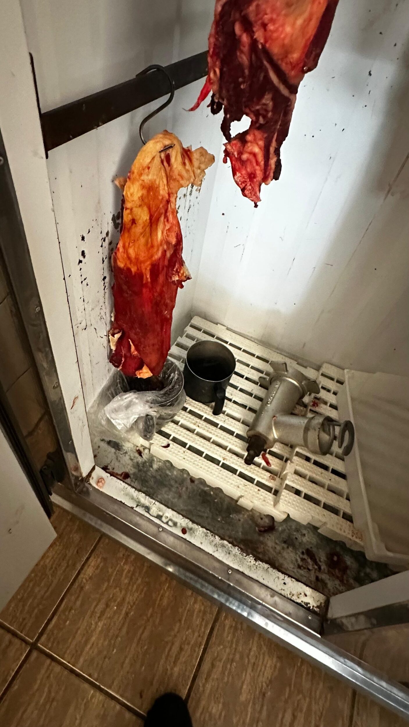 Em um vídeo divulgado pela polícia, é possível ver peças de carne penduradas com várias moscas ao redor, ferrugem em contato com o produto e até queijo estragado armazenado no mesmo local.