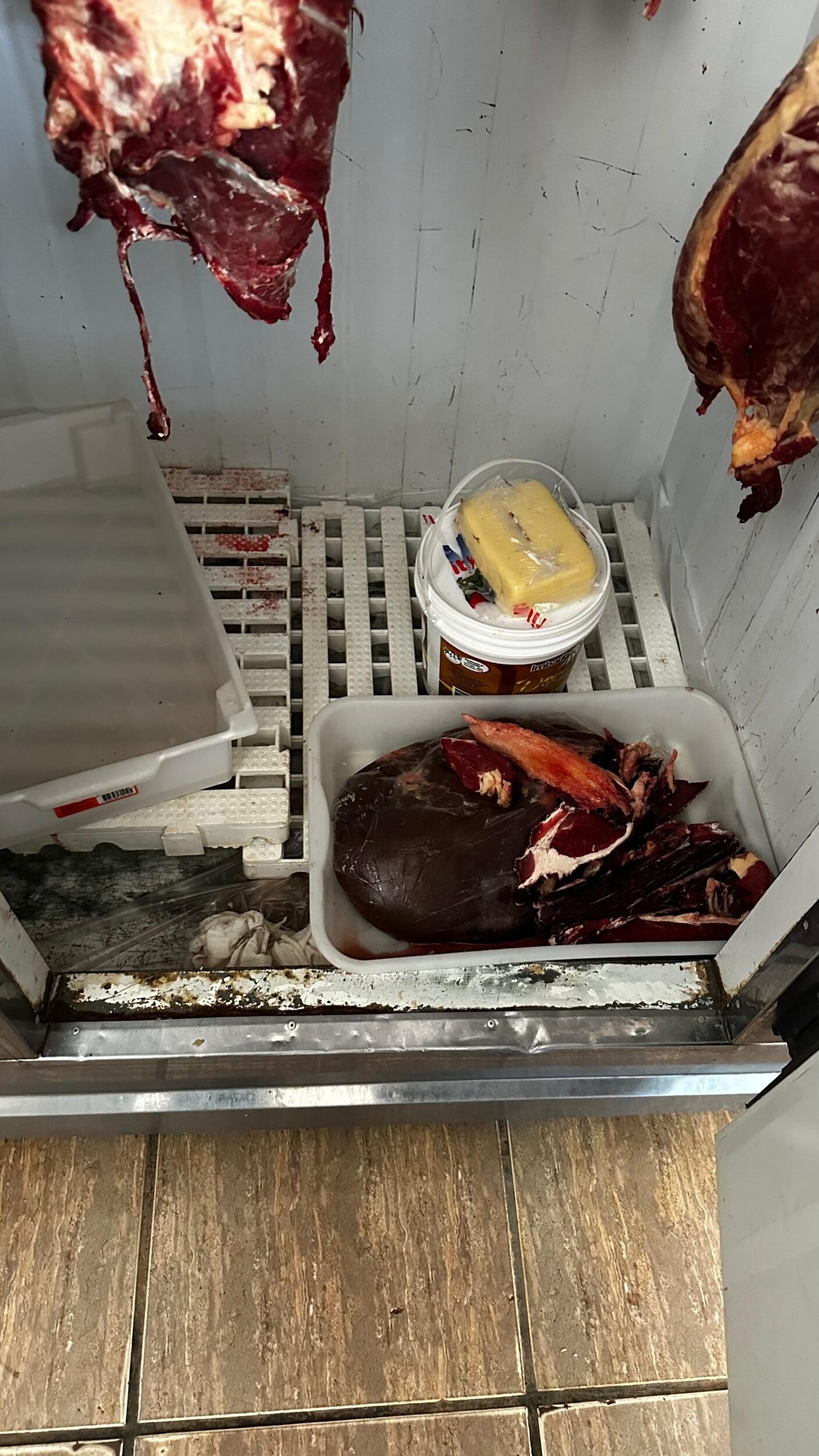 Segundo informações da Polícia Civil, o freezer onde foram encontradas carnes congeladas — entre linguiça, carne bovina, charque e carne suína —, além de 4 litros de leite, não continha informações como: