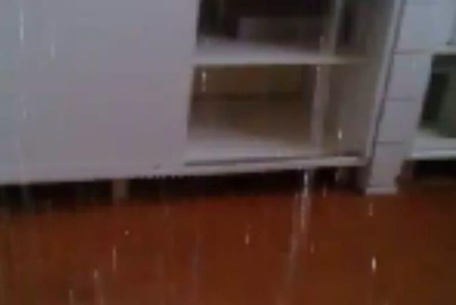 Nas imagens é possível observar o alagamento e que, enquanto chovia pelo teto, as luzes das salas também piscavam.
