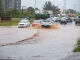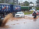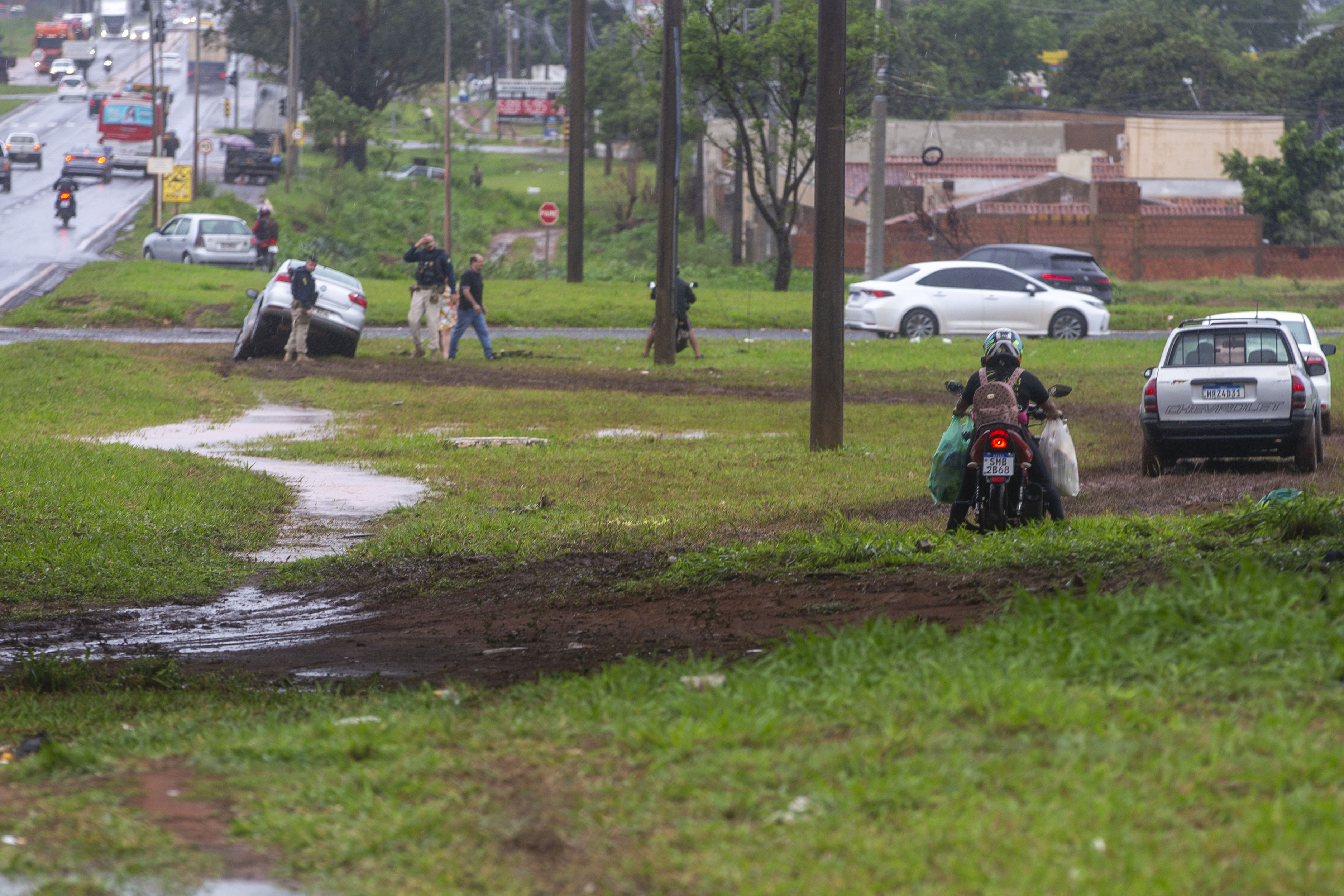 Devido à enxurrada, no final da manhã desta quarta-feira (5), motoristas que tentaram desviar pelo gramado acabaram atolando, e um deles chegou a cair em um buraco