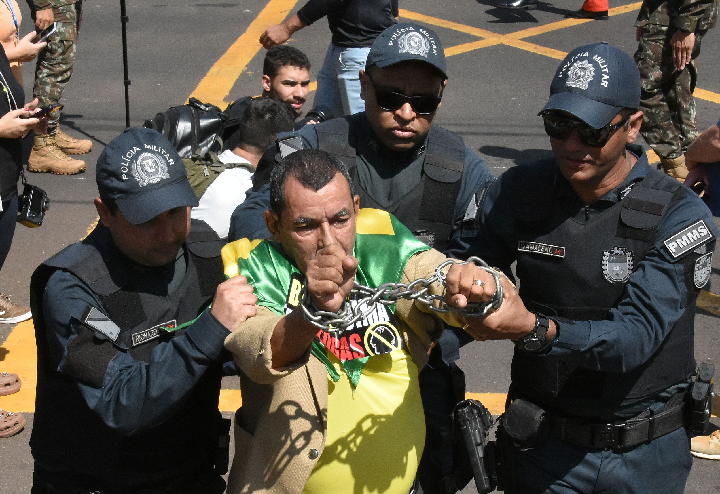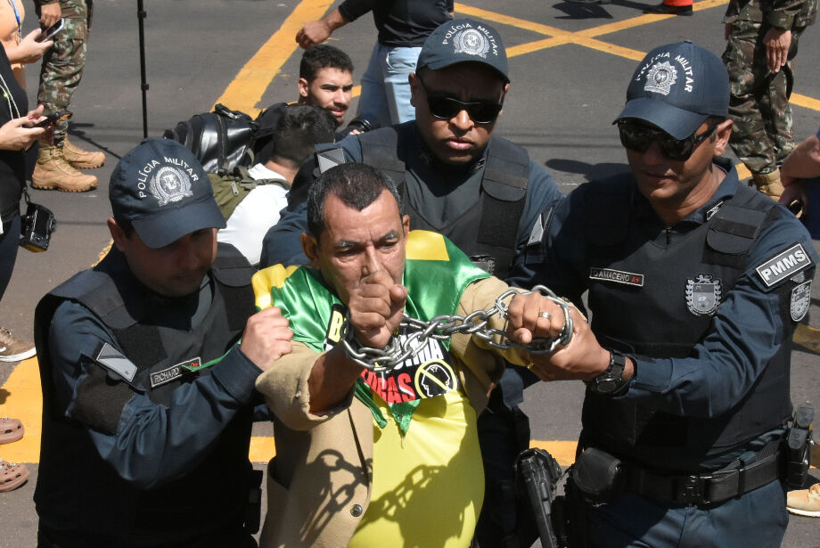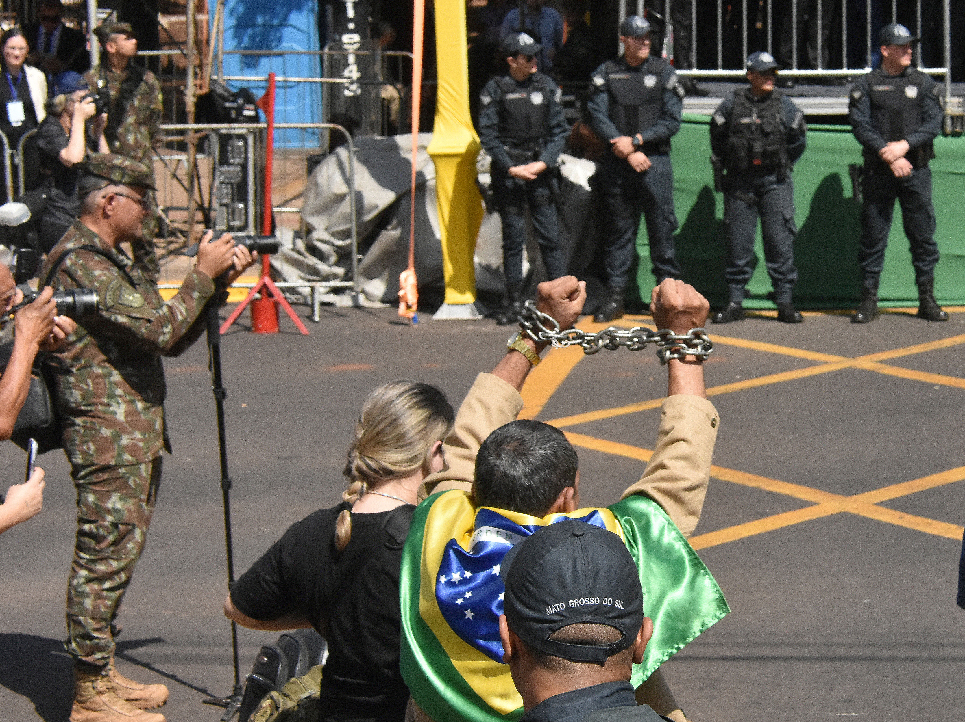 Ainda, durante o desfile, um homem, vestido de verde e amarelo (em apoio a Bolsonaro), estava com as mãos “acorrentadas” e “presas”, possivelmente em alusão a prisão domiciliar do ex-presidente Jair Bolsonaro, provavelmente pedindo por anistia aos envolvidos do 8 de janeiro e "encenando" que a direita está prestes a ser presa por perseguição política.
