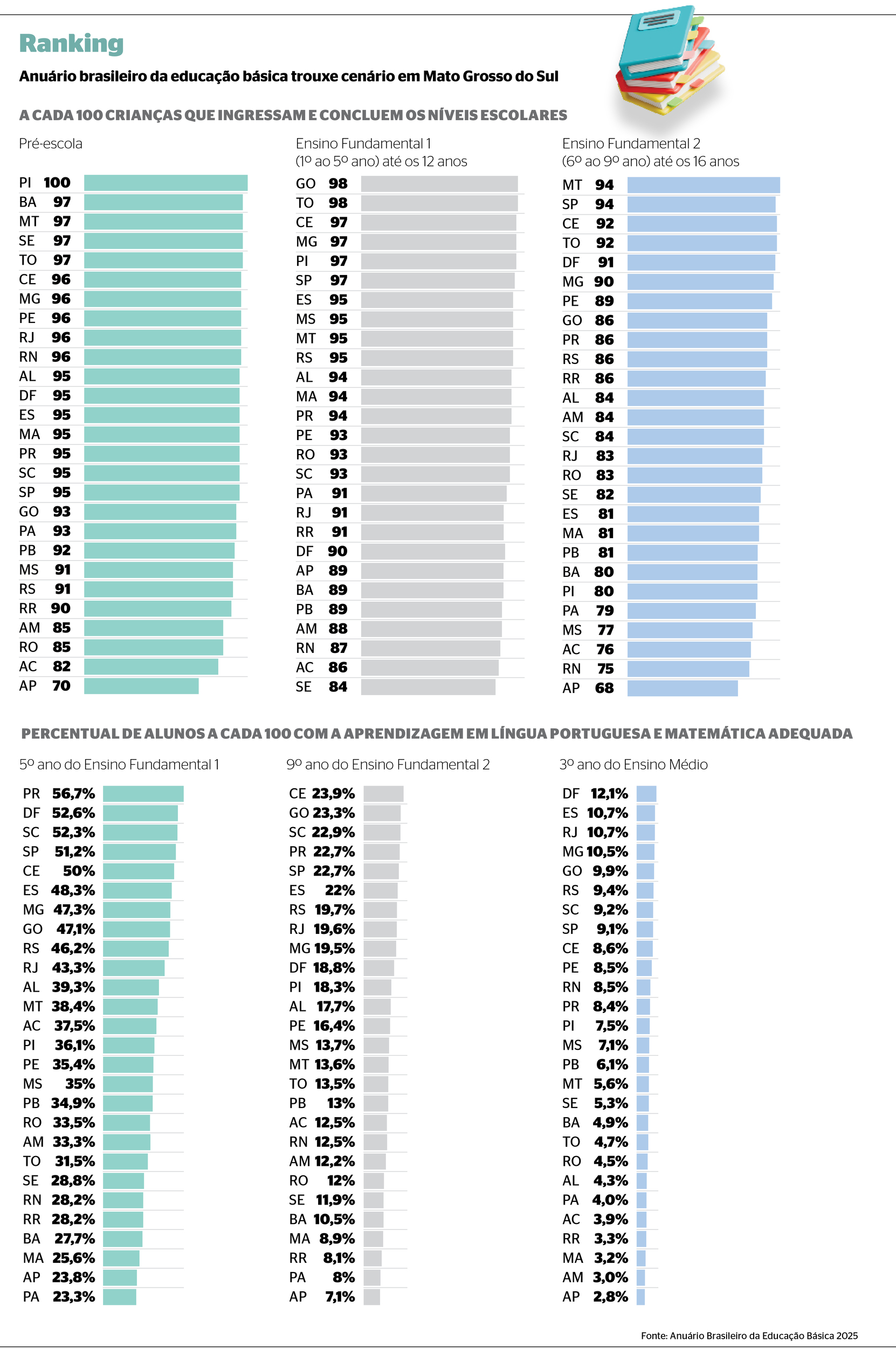 Mesmo que os dados sejam considerados baixos, Mato Grosso do Sul apresentou uma melhora de um ano para outro no quesito no Ensino Médio. No anuário de 2024, apenas 4,9% apresentavam capacidade adequada nas duas matérias mais relevantes da educação básica, o que significa um aumento de 2,2 pontos percentuais para este ano.