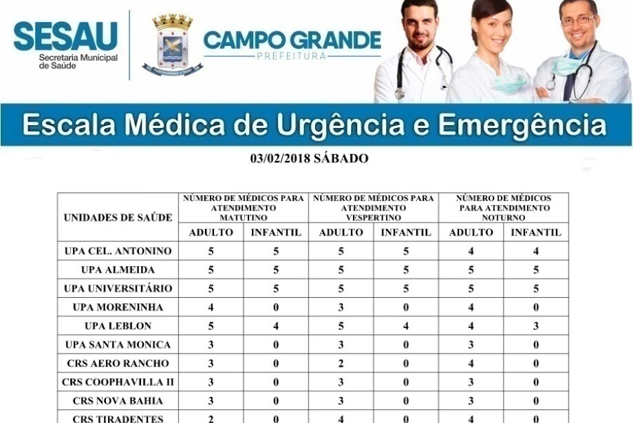 Segundo a escala, as UPA's dos bairros Coronel Antonino, Vila Almeida e Universitário terão cinco pediatras cada uma nos períodos da manhã e tarde. De noite, no Coronel Antonino, o expediente cai para quatro médicos.