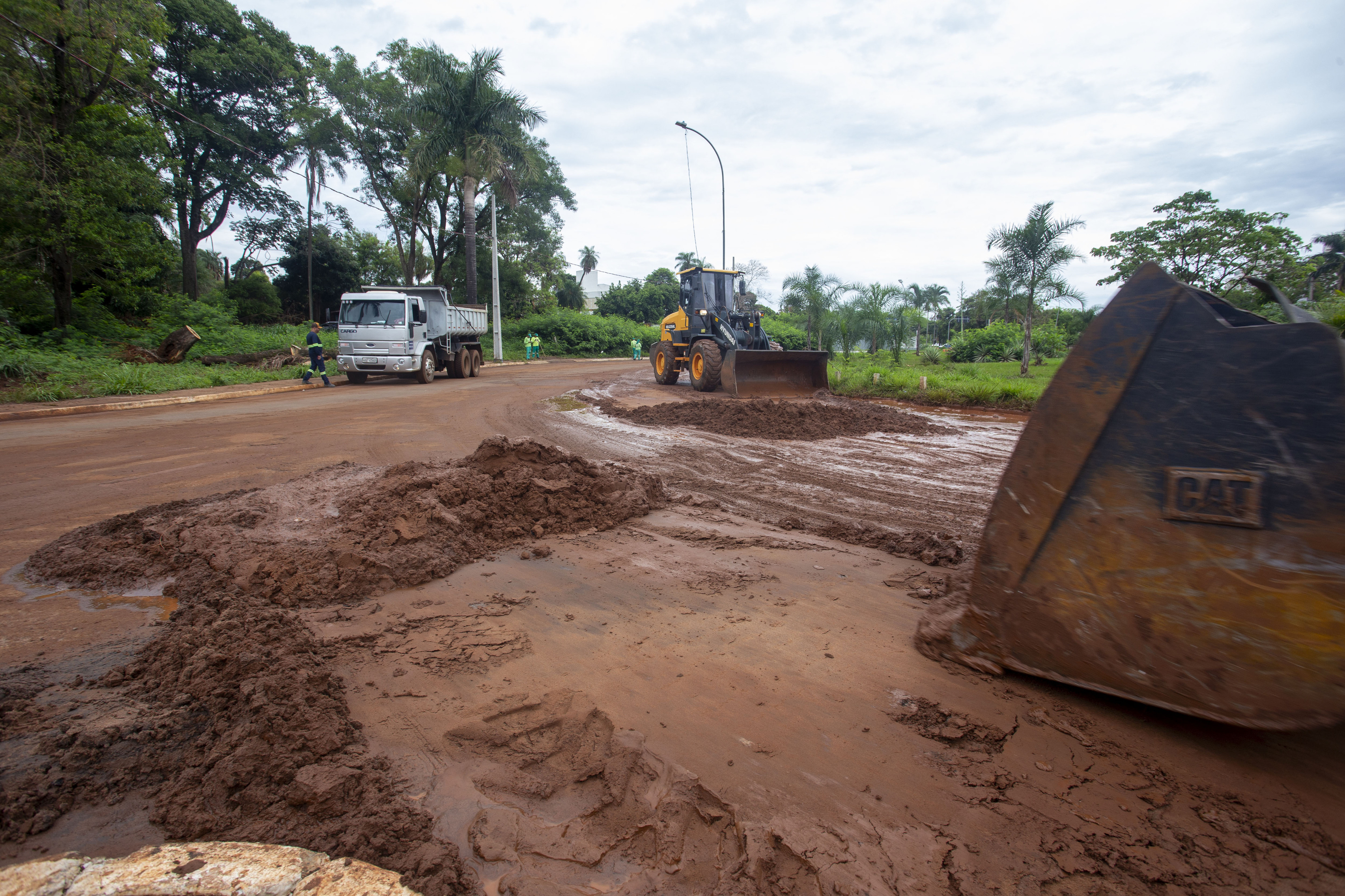 Lamaçal na Rachid Neder. Foto: Marcelo VictorO trânsito teve que ser fechado neste ponto e, momentaneamente, foi desviado para as ruas laterais. Equipes da Solurb, com 15 funcionários e dois tratores, trabalham no local para desobstruir as vias, removendo a lama, sujeira, galhos, folhas, lixo e objetos.
