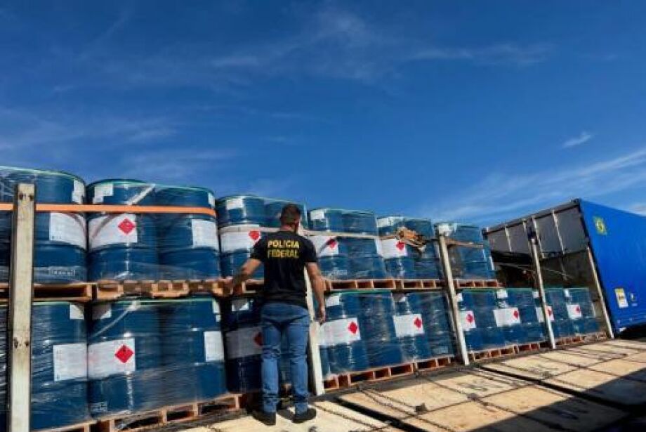 A Polícia Federal localizou 231 toneladas de acetato de etila, a carga tem valor estimado de R$ 3 milhões no mercado ilegal e tinha como destino a Bolívia