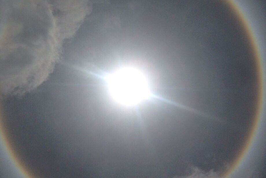 Arco-íris formado ao redor do sol, na tarde de hoje, chamou atenção dos moradores de ao menos três cidades de Mato Grosso do Sul. O fenômeno conhecido como “halo solar” foi observado em Ponta Porã, Paranhos e Amambai.