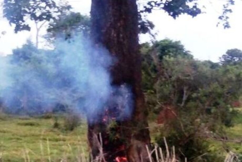 Árvore pegou fogo depois de ser atingida por raio numa área rural de Batayporã, que fica às margens da MS-276. Ao todo, o temporal que caiu neste sábado (25), em Mato Grosso do Sul, gerou mais 10 mil descargas atmosféricas.
