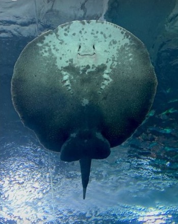 Arraia Jussara, moradora que "cumprimenta" turistas do Bioparque. Foto: Divulgação/Bioparque Pantanal Têm o corpo achatado dorsiventralmente e, por consequência, as fendas branquiais encontram-se por baixo da cabeça.