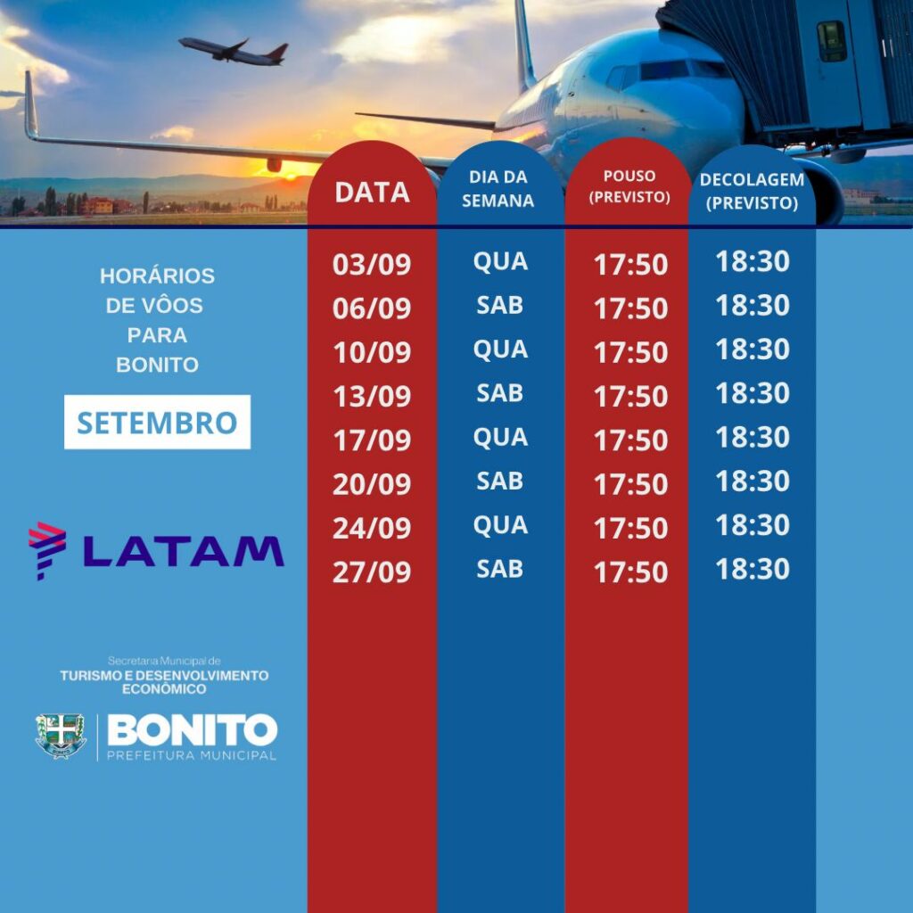 Para marcar o início das operações, será realizada uma cerimônia de inauguração na sala de embarque do aeroporto, com a presença de autoridades da Prefeitura de Bonito, Governo de MS e Latam Airlines.