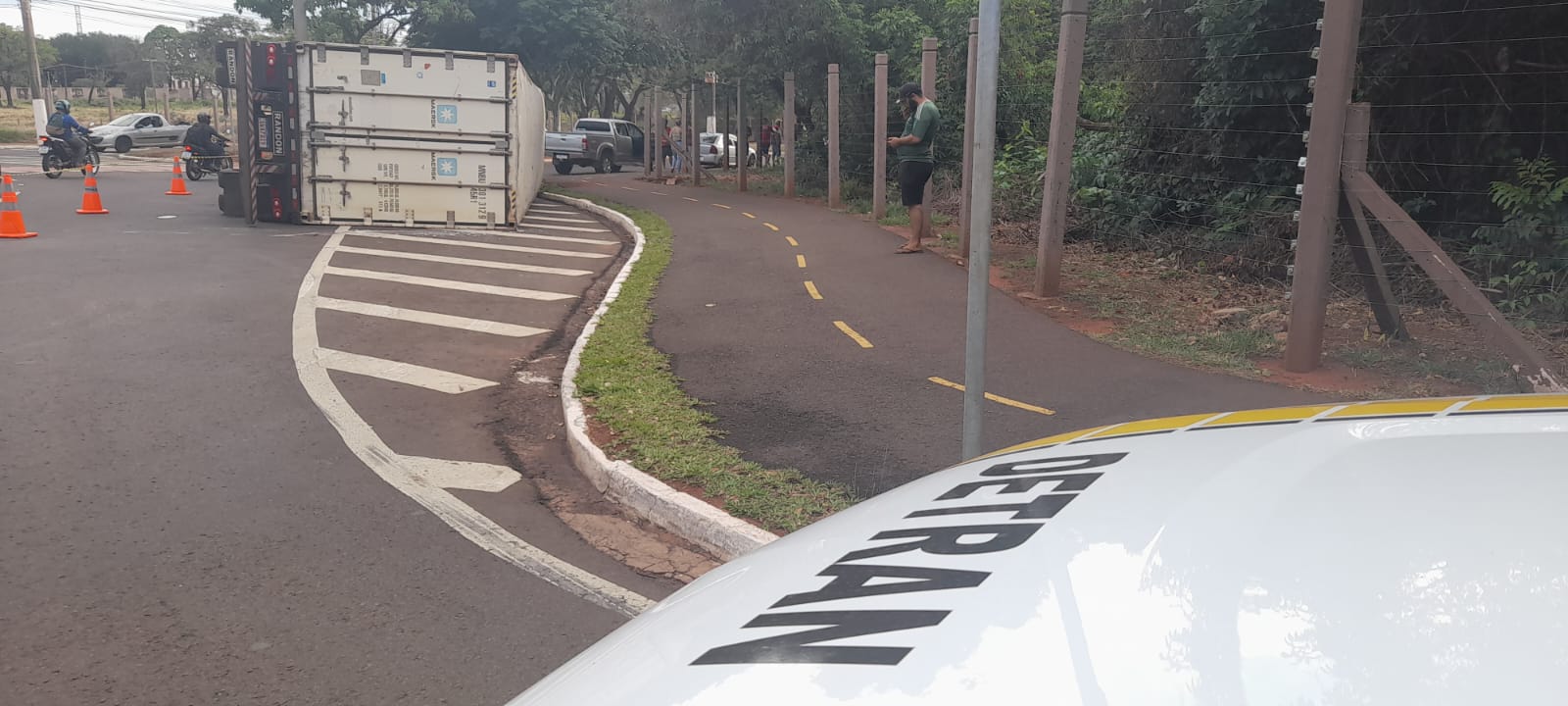 Um caminhão carregado com aproximadamente 28 toneladas de carne de frango, que vinha de Mogi Mirim (SP), perdeu o controle e acabou tombando na rotatória do Parque dos Poderes, em Campo Grande.