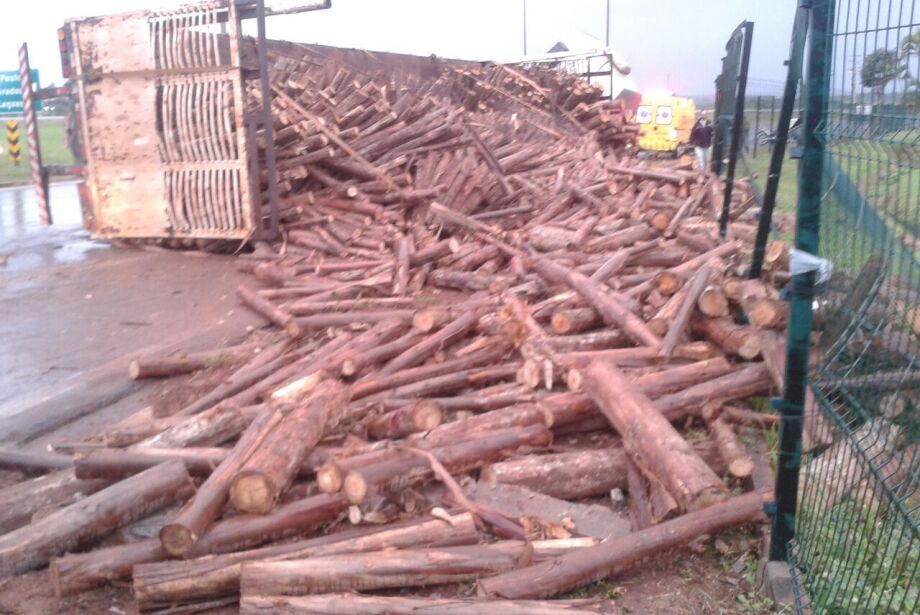 Segundo o motorista de 43 anos, que preferiu não ser identificado, veículo foi carregado com a madeira em uma fazenda de Bandeirantes e carga seria levada para uma indústria no Indubrasil.
