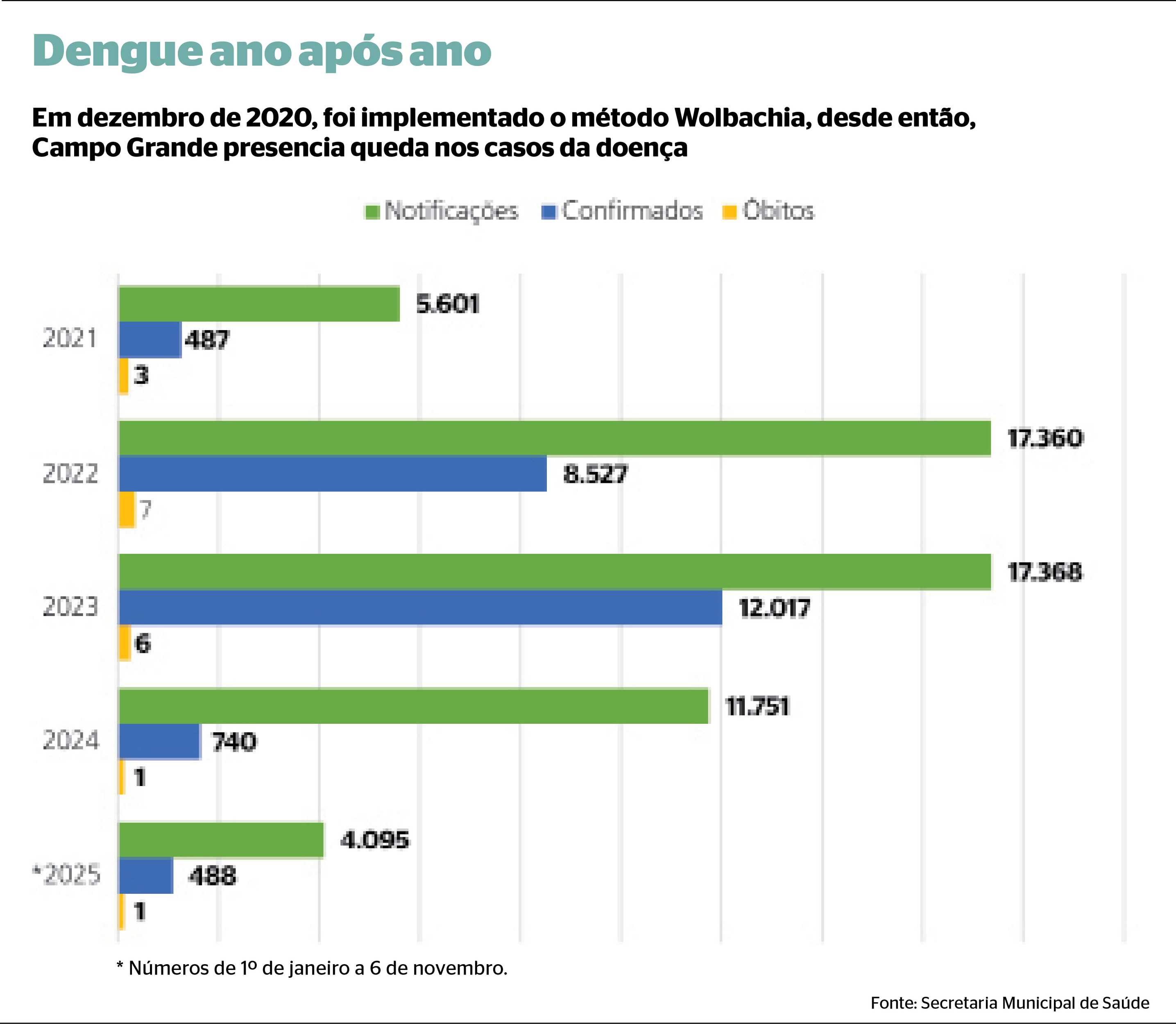 Quase cinco anos depois de acompanhar outras cidades do Brasil e implementar o chamado método Wolbachia, os resultados da ação começaram a aparecer e as notificações de dengue neste ano em Campo Grande caíram cerca de 65% em relação aos registros de 2024. A continuidade da queda de casos é a esperança da Secretaria Municipal de Saúde (Sesau) para os próximos anos.