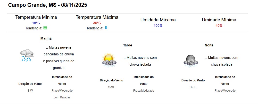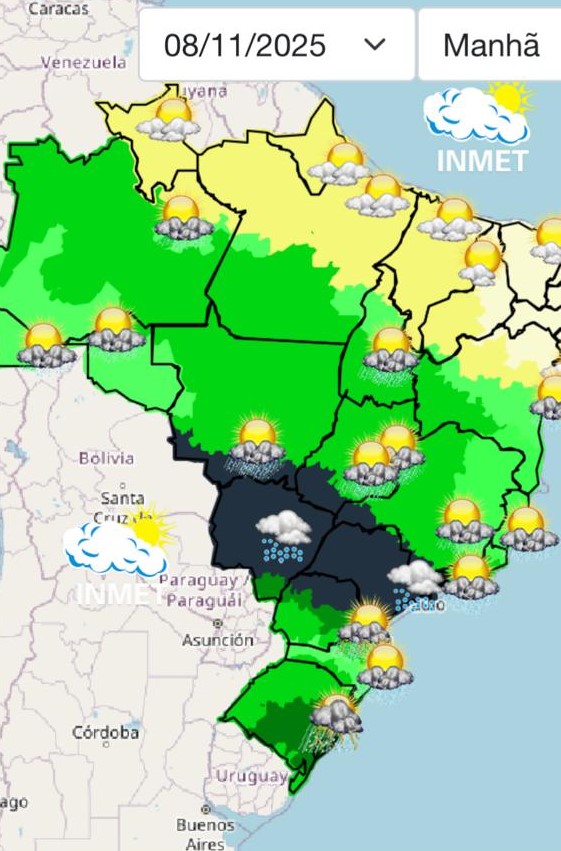 Com alerta de temporal para este sábado (08), o INMET havia previsto durante a manhã muitas nuvens, com pancadas de chuva e possível queda de granizo, mas até o momento de publicação da reportagem não há registros dessas condições mais intensas.
