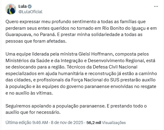 O presidente Luiz Inácio Lula da Silva fez um pronunciamento a pouco na rede social X, antigo Twitter, prestando condolências às milhares de vítimas afetadas pelo ciclone.