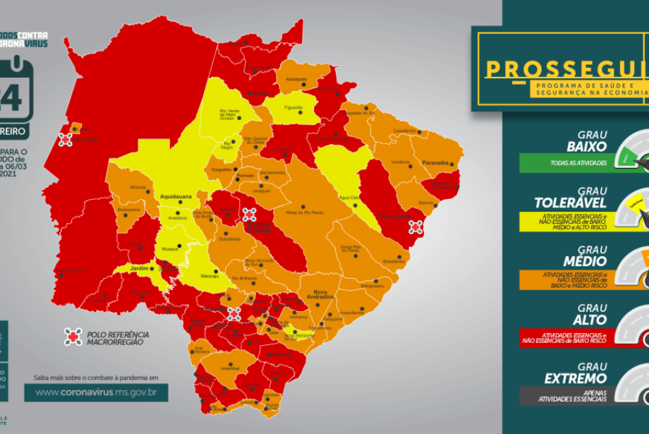 Nenhum município das quatro macrorregiões de saúde do Estado (Corumbá, Campo Grande, Três Lagoas e Dourados), apresentou baixo risco (faixa verde) ou risco extremo (faixa cinza).