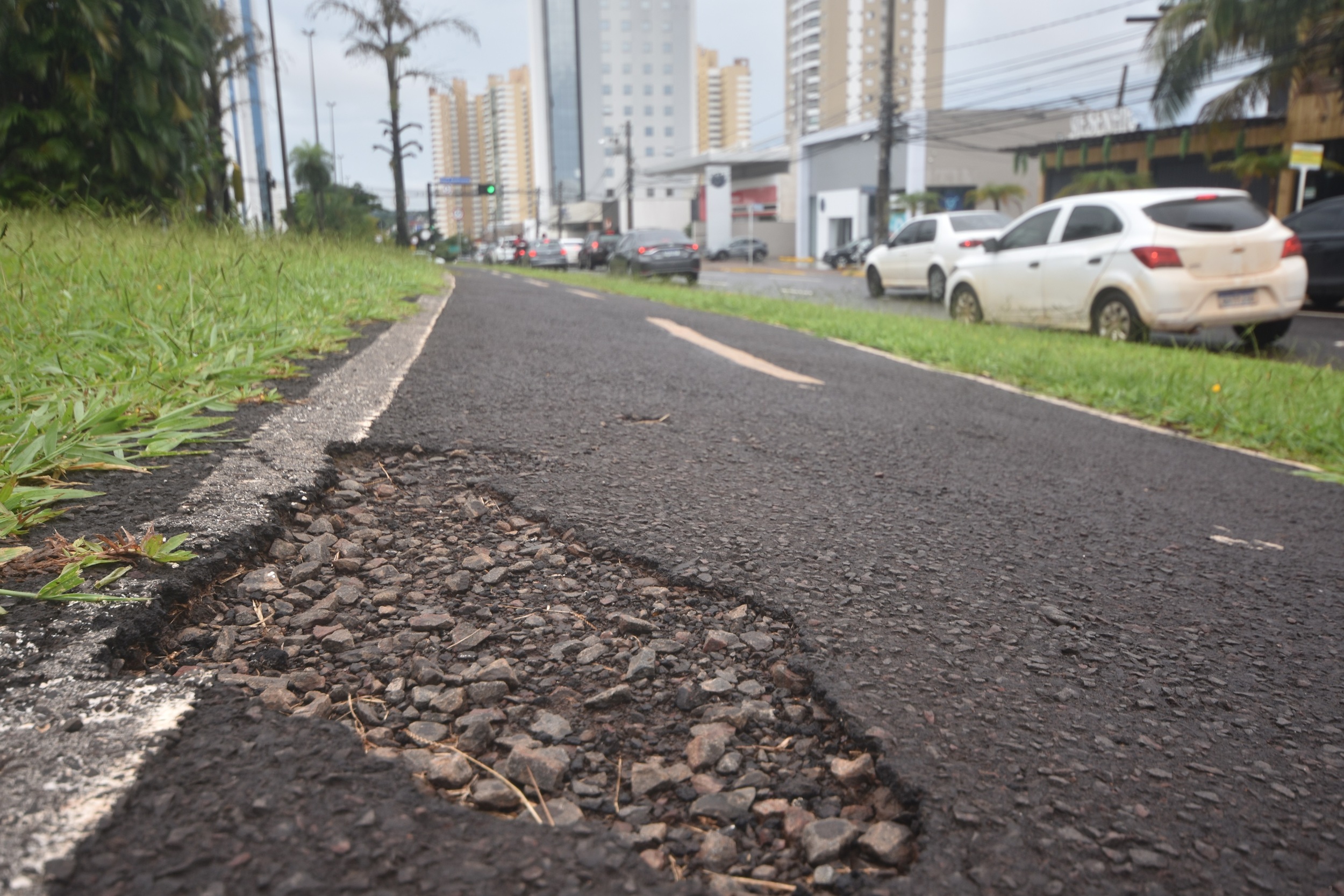 Buraco em ciclovia na avenida Afonso Pena. Foto: Marcelo VictorEm linha reta, a distância representa uma pedalada entre Campo Grande e Nova Alvorada do Sul, cidades que ficam a 113 quilômetros uma da outra.
