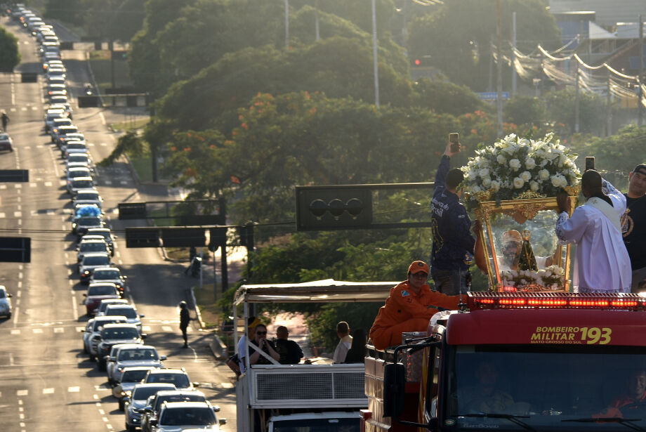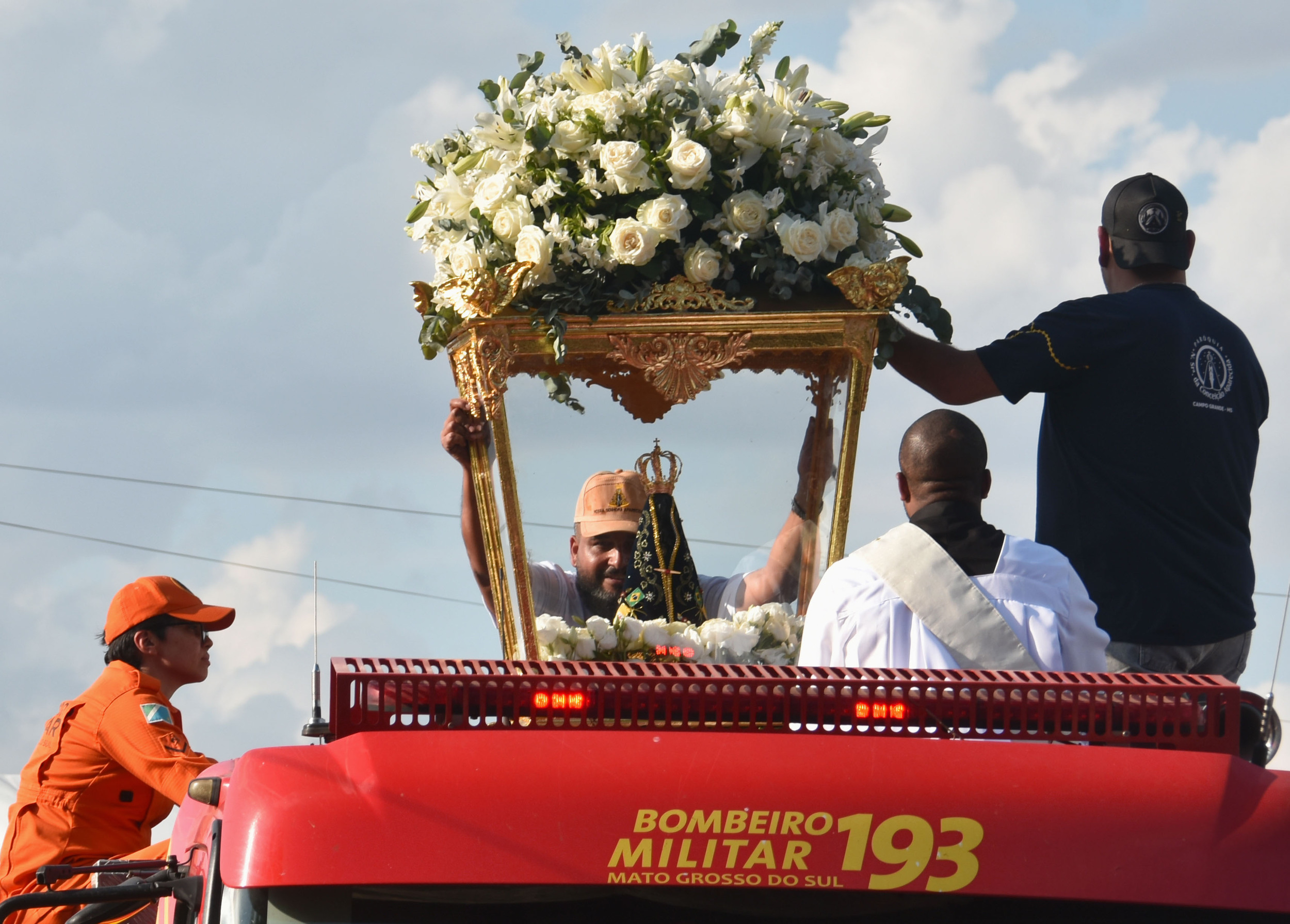 A imagem de Nossa Senhora Aparecida, posicionada embaixo de um arranjo de flores branco, foi transportada em uma Auto Bomba – veículo oficial do Corpo de Bombeiros Militar de Mato Grosso do Sul. A imagem da Padroeira tem aproximadamente 40 centímetros de altura e o aranjo de flores tem cerca de um metro.