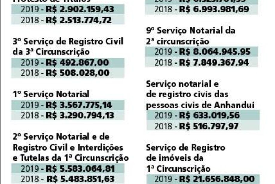 O cartório que mais faturou em Campo Grande no ano passado foi o Serviço de Registro de Imóveis da 1ª Circunscrição, com uma receita de R$ 21,6 milhões. O segundo maior faturamento foi do 3º Serviço Notarial: R$ 13,4 milhões.