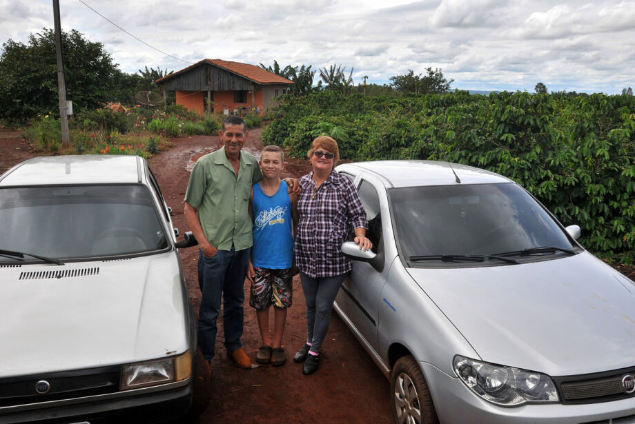 Na equação do casal Sebastião e Verônica Dionísio, trabalho e produção de café são iguais a dois carros. Sebastião, de 58 anos, e Verônica, de 61, posam para a foto entre um Uno e um Siena. Abraçam o neto Carlos Eduardo, o Cadu, de 11 anos, que, pela primeira vez, visita o sítio dos avós no assentamento Itamarati II, em Ponta Porã, na fronteira com o Paraguai. Os veículos foram adquiridos à vista, com rendimentos de duas safras de café. A próxima compra, planejada para 2017, será de uma caminhonete.