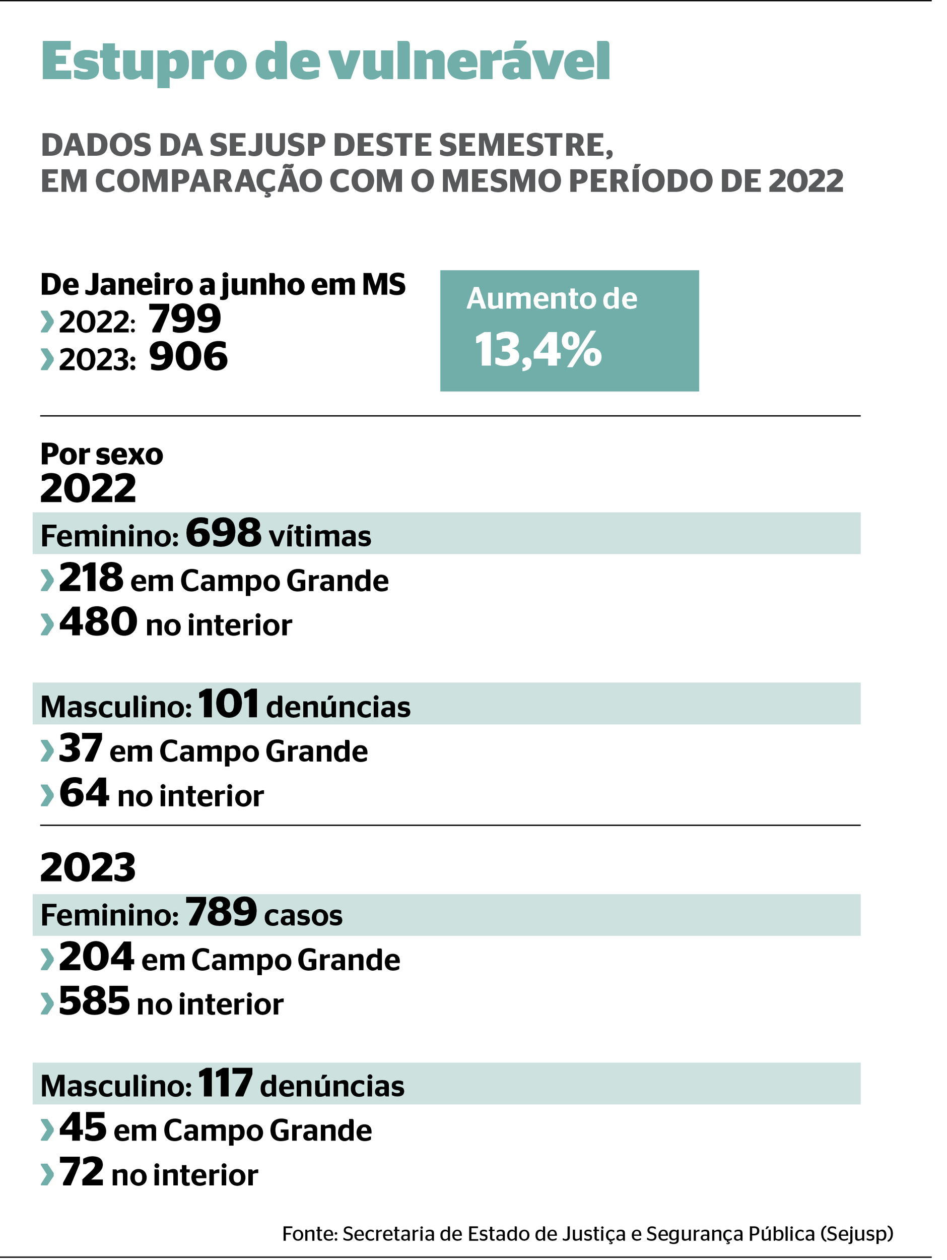 De janeiro a junho deste ano, Mato Grosso do Sul teve um aumento de 13,4% nos registros de estupro de vulnerável, em comparação com o mesmo período do ano passado. Ao todo, a Secretaria de Estado de Justiça e Segurança Pública (Sejusp) informou que foram notificados 906 casos neste ano, enquanto em 2022, no período, foram 799.