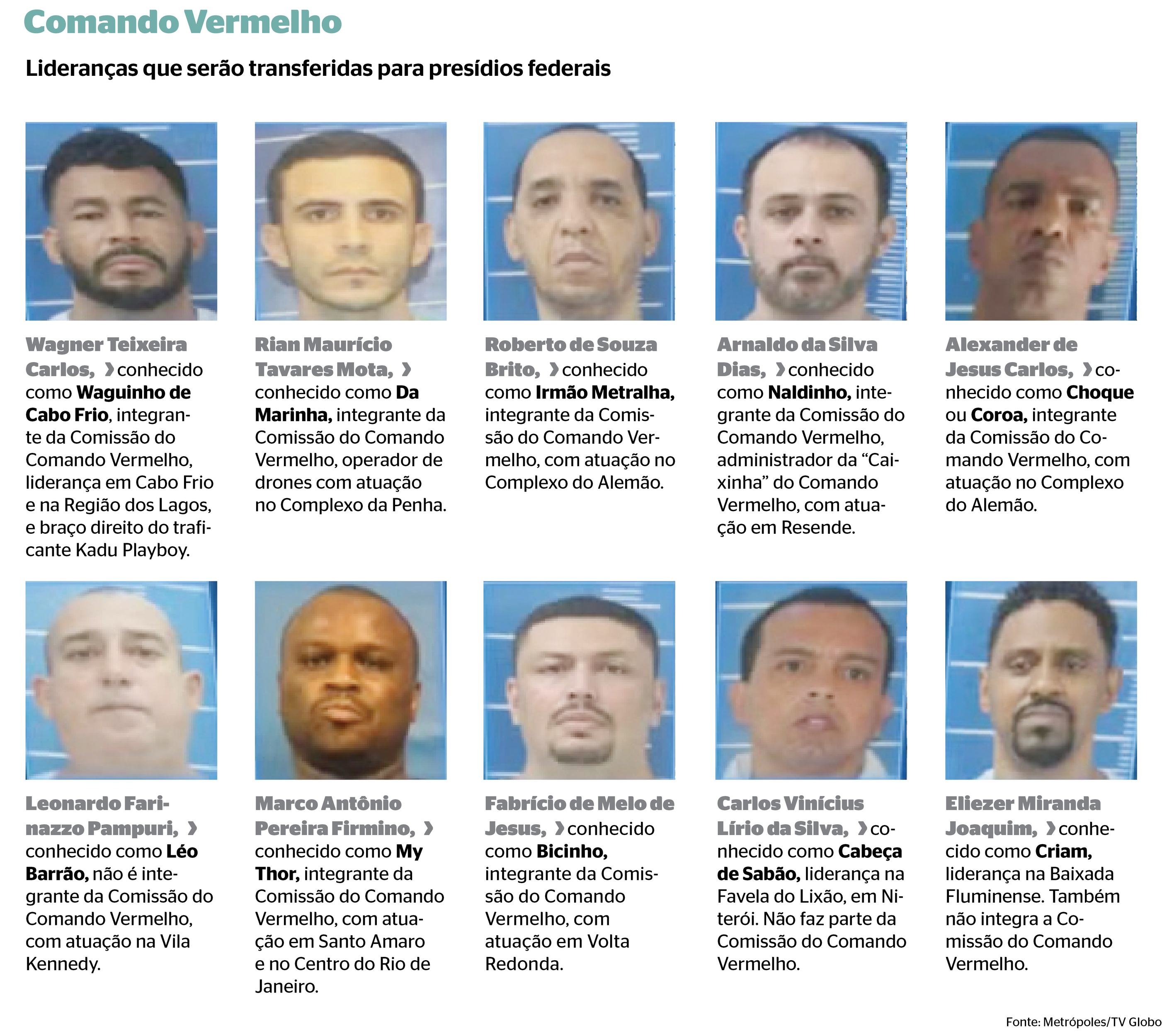 De acordo com o jornal Metrópoles, os 10 presos a serem transferidos do presídio de Bangu, no Rio de Janeiro, são: Wagner Teixeira Carlos, conhecido como Waguinho de Cabo Frio; Rian Maurício Tavares Mota, conhecido como Da Marinha; Roberto de Souza Brito, conhecido como Irmão Metralha; Arnaldo da Silva Dias, conhecido como Naldinho; Alexander de Jesus Carlos, conhecido como Choque ou Coroa; Marco Antônio Pereira Firmino, conhecido como My Thor; Fabrício de Melo de Jesus, conhecido como Bicinho; Leonardo Farinazzo Pampuri, conhecido como Léo Barrão; Carlos Vinícius Lírio da Silva, conhecido como Cabeça de Sabão; e Eliezer Miranda Joaquim, conhecido como Criam.