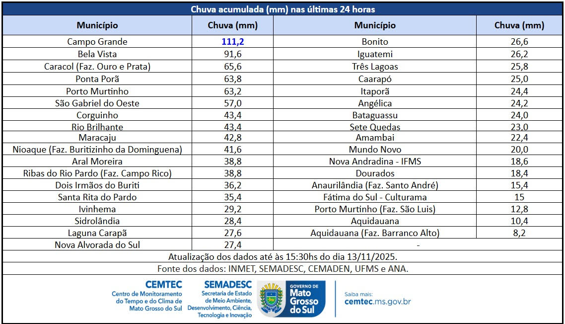 Temporal atingiu Campo Grande na noite de quarta-feira (12) e tarde de quinta-feira (13). De acordo com o Centro de Monitoramento do Tempo e do Clima (Cemtec-MS), 111,2 milímetros foram registrados nas últimas 24 horas, na Capital.