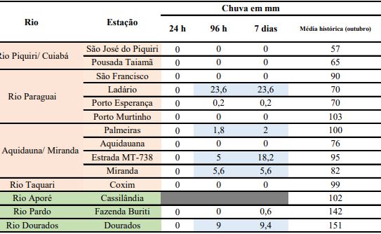 Nos primeiros sete dias de outubro do ano passado choveu em todos os locais onde é feita a medição do nível dos rios, com acumulados que chegaram a 56 milímetros. Agora, a precipitação ocorreu em apenas três pontos e com volume máximo de 23,7 milímetros (em Ladário).