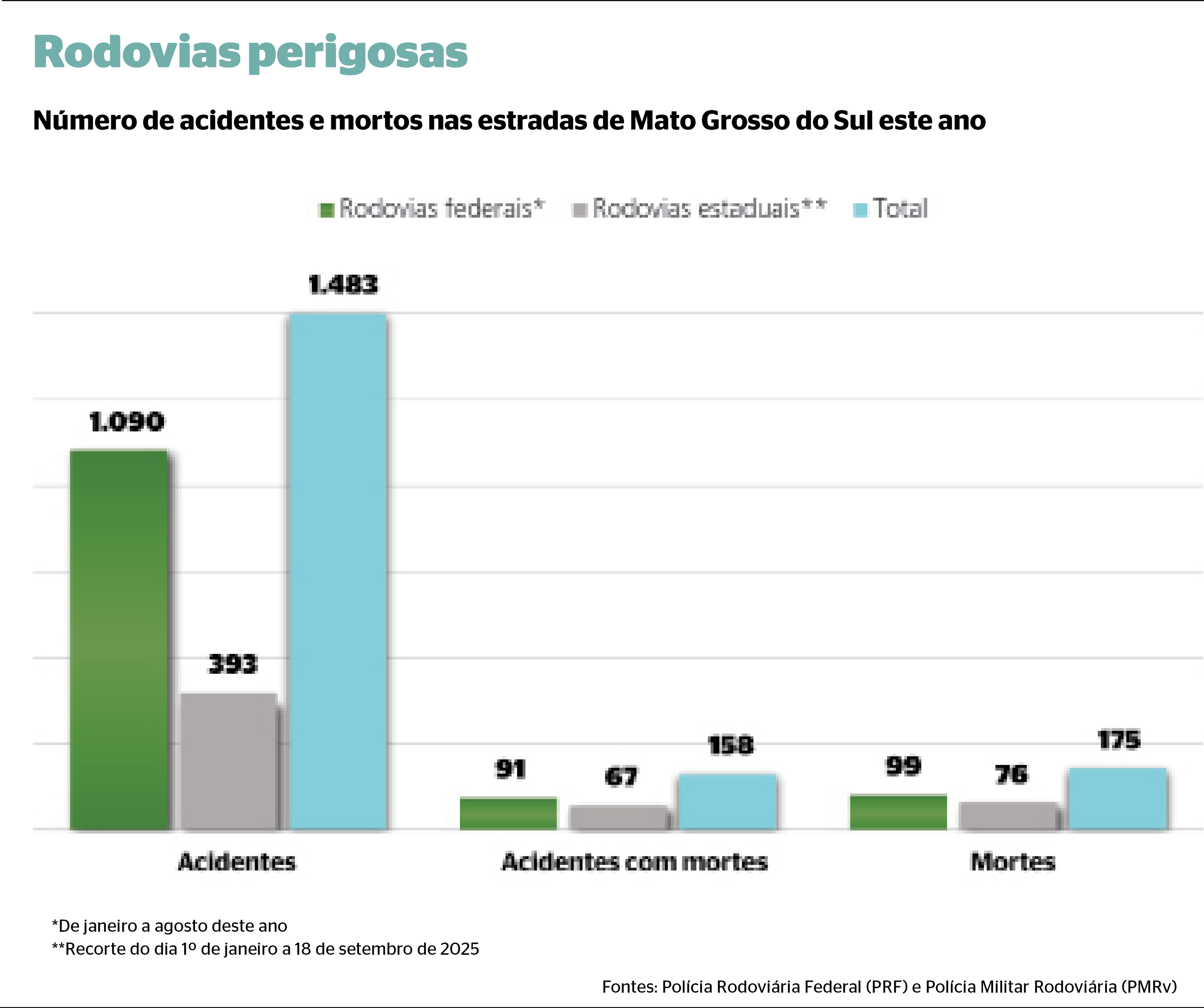 De janeiro a agosto deste ano, as rodovias federais de Mato Grosso do Sul (BR-060, BR-158, BR-163, BR-262, BR-267, BR-376 e BR-487) somaram 1.090 acidentes, dos quais 320 foram graves e 91 foram com mortes. Além disso, 99 pessoas morreram e 1.140 ficaram feridas.