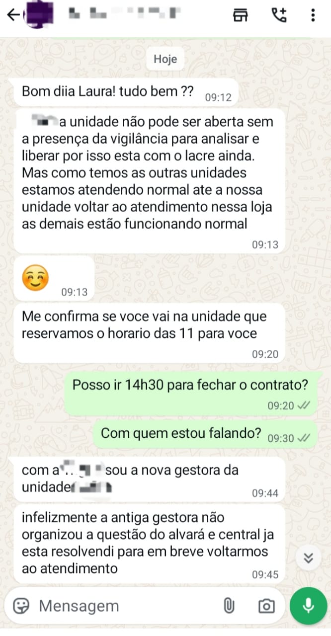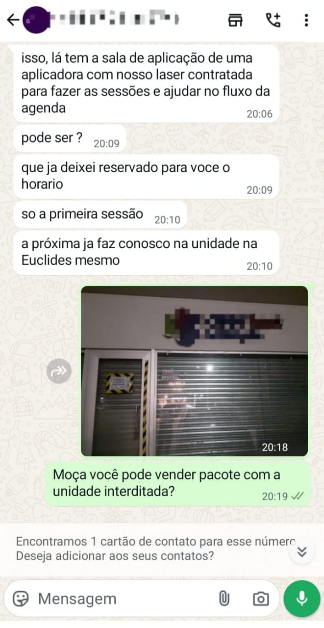 O que não foi o caso, já que ao contatar a clínica foi possível agendar horário para esta terça-feira (8), às 13h. Além disso, a nova administradora tenta, por todos os meios, fechar o contrato de forma virtual, por meio do WhatsApp.
