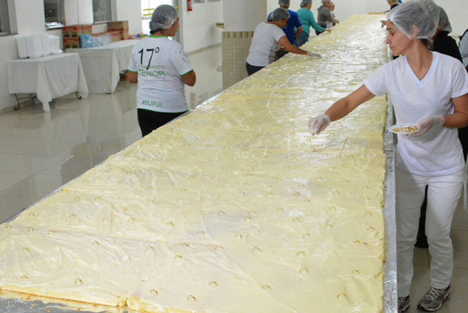 Com 21 metros, uma tonelada e 1 mil alianças, o tradicional bolo de Santo Antônio, começa a ser distribuído amanhã a partir das 7h, em Campo Grande. Para montar o famoso bolo do santo casamenteiro foram necessárias 240 formas de pão de ló, 120 quilos de farinha de trigo, 120 quilos de açúcar, 3 mil ovos, 100 litros de calda de bolo, 300 quilos de recheio, 200 litros de chantilly e 30 quilos de geleia de brilho.