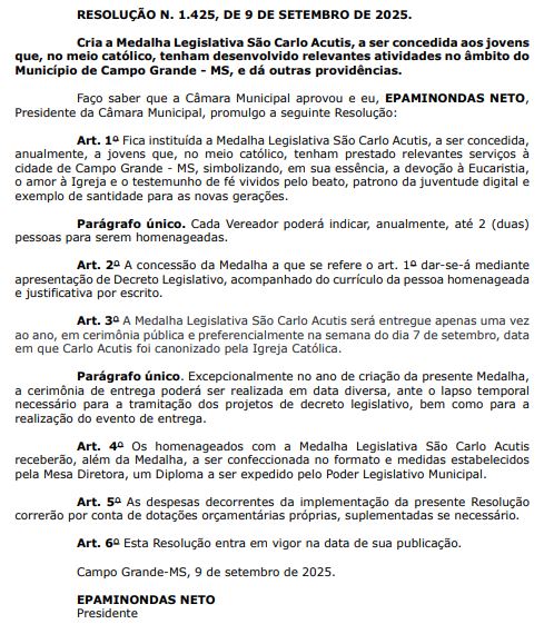 Foi publicado na edição desta quinta-feira (11) do Diário Oficial de Campo Grande - (Diogrande), a criação da Medalha Legislativa São Carlo Acutis, autorizada pela Câmara Municipal de Campo Grande e destinada a reconhecer anualmente jovens católicos que tenham prestado relevantes serviços à cidade.