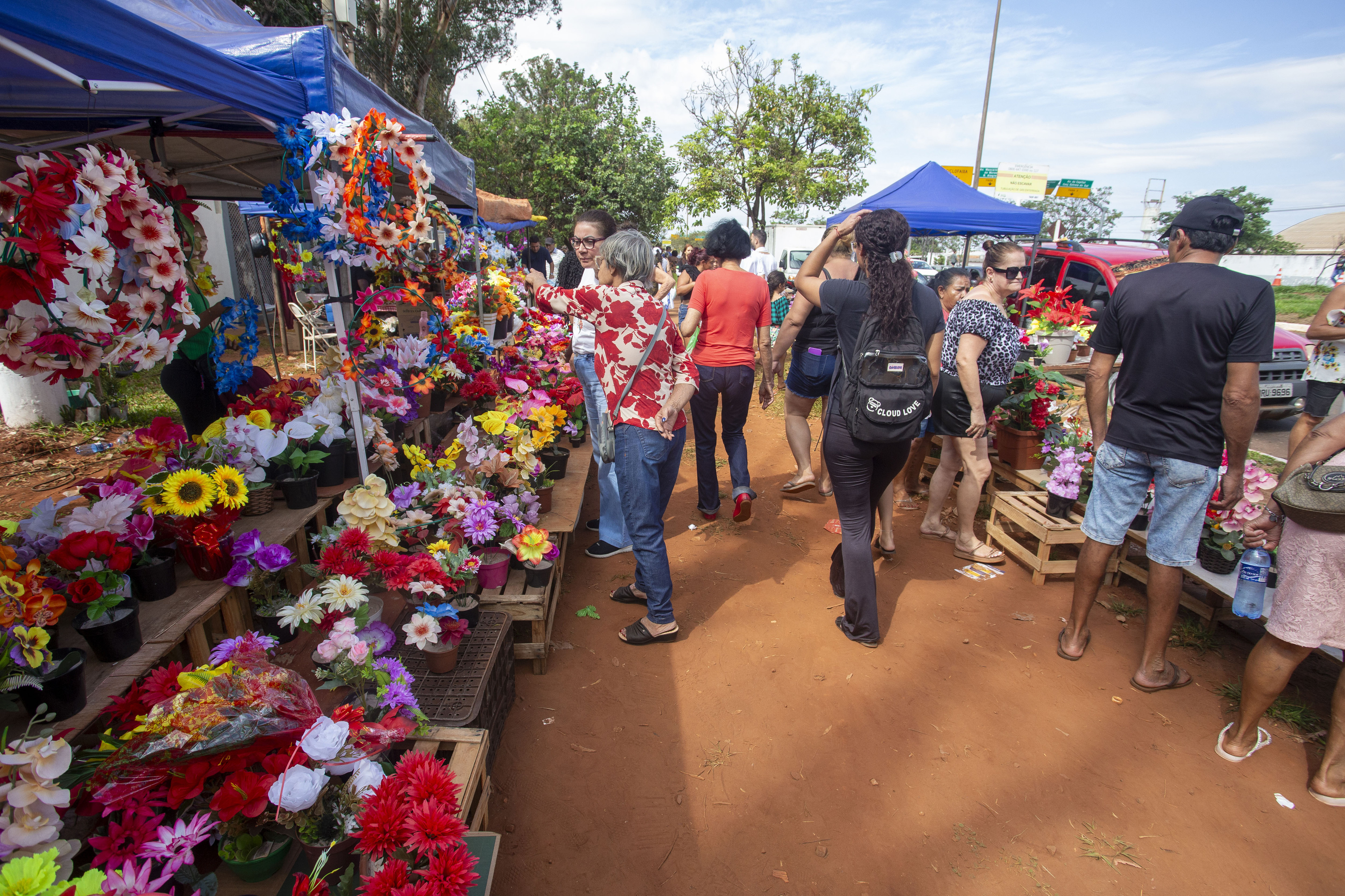 Barracas de flores artificiais/naturais e velas, além de tendas de comidas e bebidas, como pastel, cachorro quente, salgados, pipoca doce/salgada, espetinho, churros, água mineral/gaseificada, água de coco e caldo de cana tomaram conta da calçada e arredores dos cemitérios São Sebastião (Cruzeiro) e Santo Amaro.