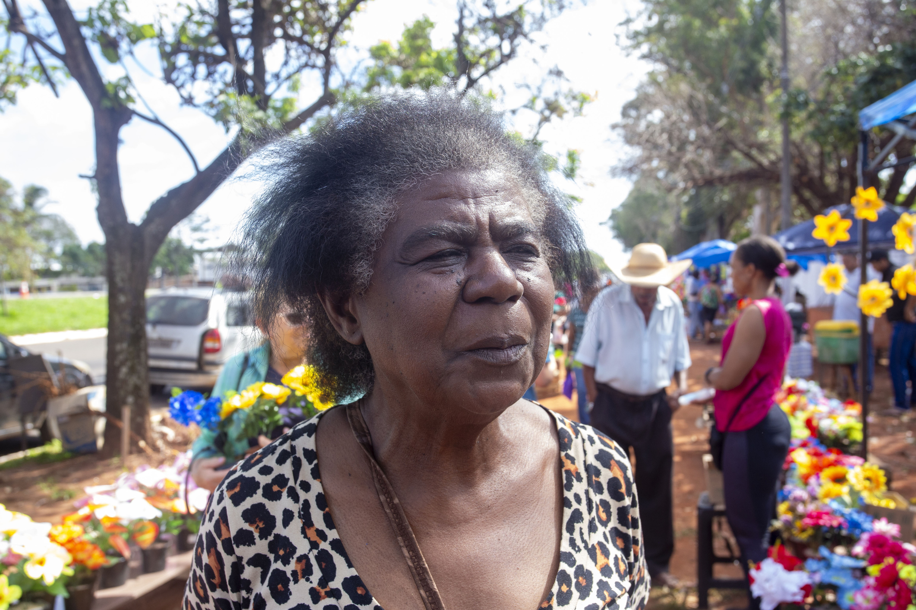 Funcionária pública aposentada, Maria Roberta da Silva, vende flores artificiais, há três décadas, na calçada do Cemitério São Sebastião (Cruzeiro) e é proprietária de quase todas as barracas.