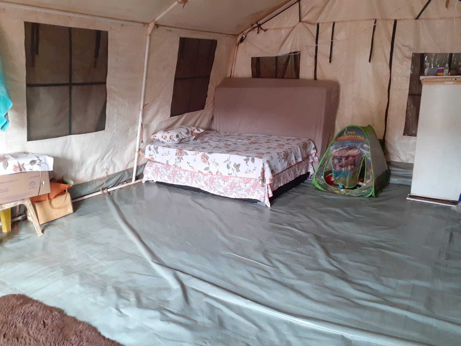 Na barraca também está alocada a senhora, Neide Lopes, de 42 anos, e mais três famílias. O espaço está cuidado e conforme demandado pelos moradores receberam produtos de limpeza, balde, vassoura, pano de chão e rodo para manter a higiene.
