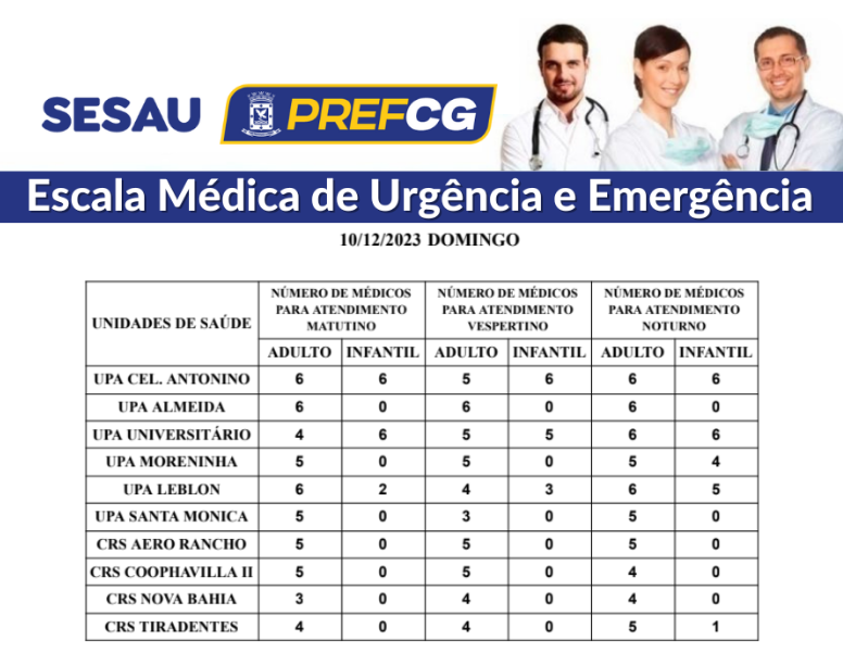 A Prefeitura Municipal de Campo Grande, divulgou na manhã deste domingo (10), a lista de disponibilidade médica para atender a população nas Unidades de Pronto Atendimento (UPA) e nos Centros Regionais da Saúde (CRS) da capital.