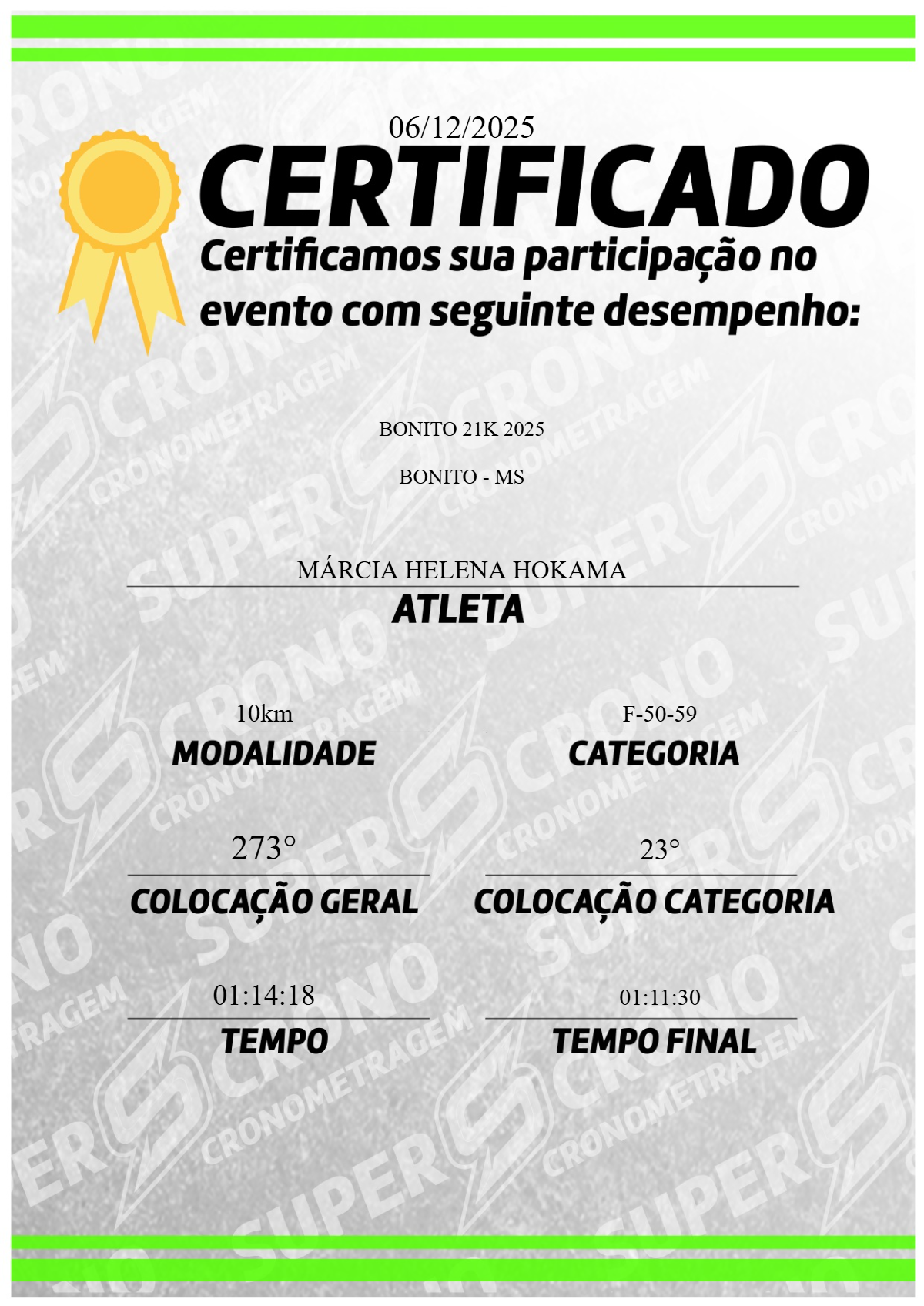 De atestado médico desde o último dia 25 de novembro por questões de saúde, a secretária municipal de Fazenda de Campo Grande Márcia Helena Okama participou da 11ª edição da prova de 21km de Bonito, disputada no último final de semana, na cidade homônima, no interior do Estado.