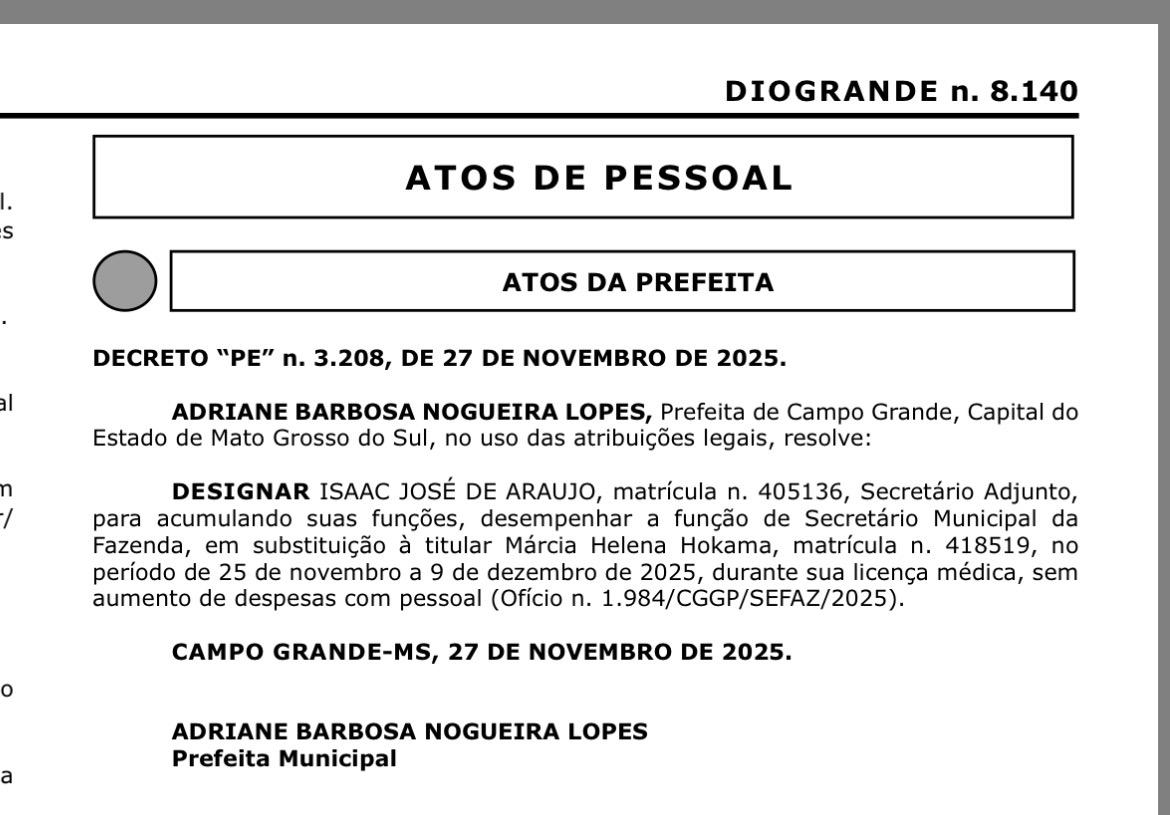 De acordo com o publicado no Diário Oficial de Campo Grande, a titular da secretaria de fazenda esta ausente do cargo desde o último fim do mês passado, espaço ocupado interinamente pelo secretário-adjunto Isac José de Araújo desde sua saída. Conforme o documento assinado pela prefeita Adriane Lopes (PP), a licença da secretária segue até esta terça-feira (9).