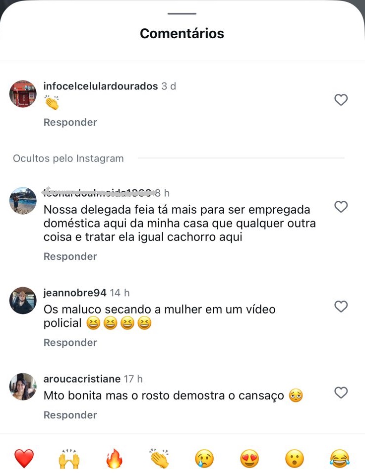 Reprodução"Nossa, delegada feia, tá mais para ser empregada doméstica aqui da minha casa que qualquer outra coisa e tratar ele igual cachorro aqui", dizia o comentário que originalmente aparecia na sessão "ocultos pelo Instagram" e já não aparece visível na plataforma.