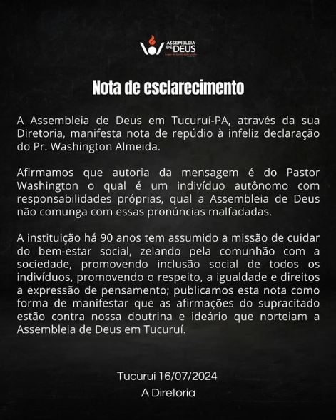 Ainda, na quarta-feira (17) a igreja emitiu outra nota tentando amenizar a situação gerada pela fala do religioso.