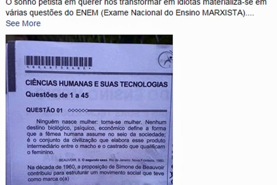 Os deputados Jair Bolsonaro (PP-RJ) e Marcos Feliciano (PSC-SP) usaram as redes sociais neste fim de semana para acusar o Exame Nacional do Ensino Médio de doutrinação. O motivo da reclamação foi uma questão da prova de ciências humanas, que abordou a célebre frase "Não se nasce mulher, torna-se mulher", da escritora e filósofa francesa Simone de Beauvoir. A questão abordava o tema das lutas feministas no início do século XX.