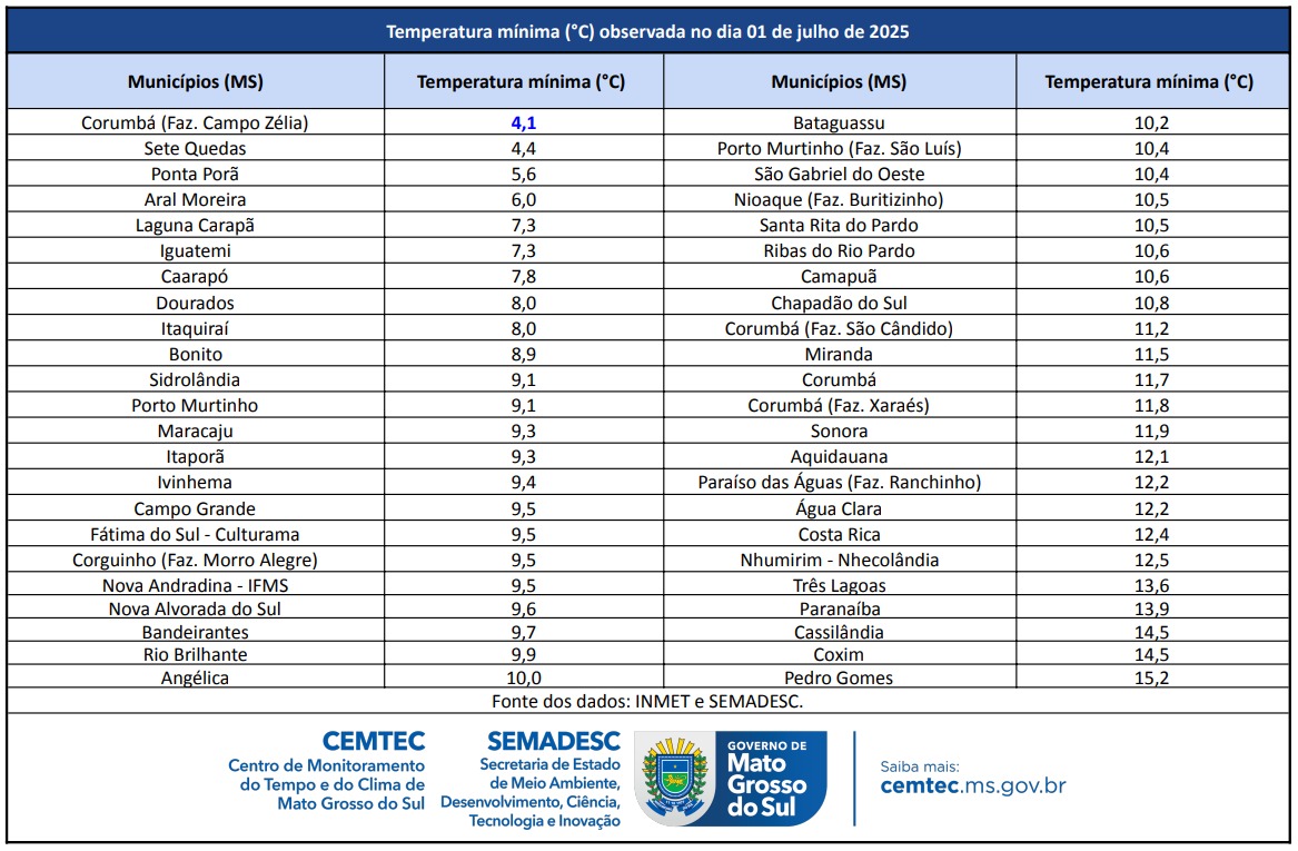 Mato Grosso do Sul registrou temperaturas de um dígito, na madrugada desta terça-feira (24), em vários municípios. Esta é a segunda onda de frio do inverno 2025.