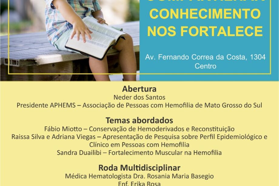 Com o tema “Compartilhar Conhecimento nos Fortalece”, a palestra contará com a participação do presidente da Associação das Pessoas Com Hemofilia e Outras Coagulopatias do MS (Aphems) Neder dos Santos, da médica Hematologista Dra. Rosania Maria Basegio, que vai coordenar um debate multidisciplinar com a enfermeira Erika Rosa, a professora de educação física Sandra Duailibi e a psicóloga Alessandra Devicari.
