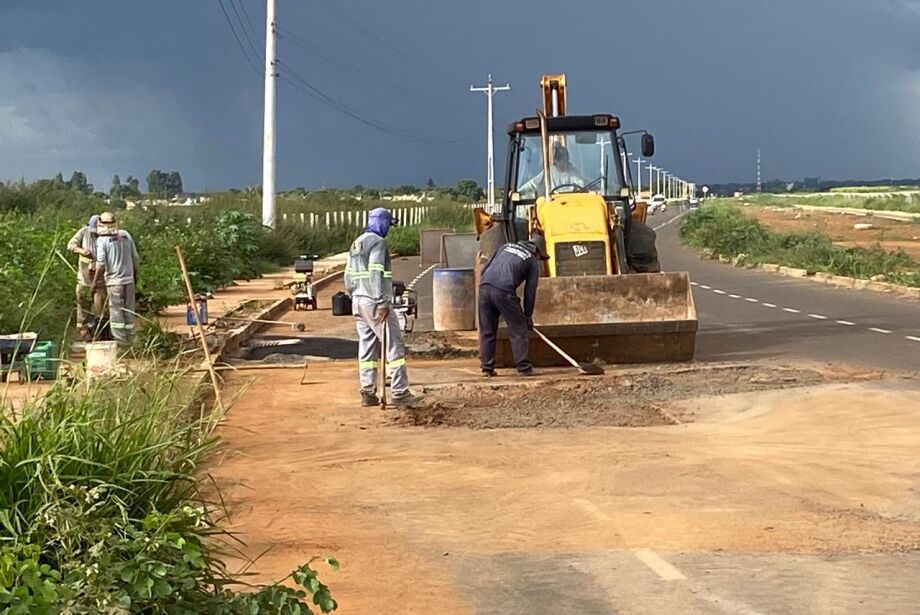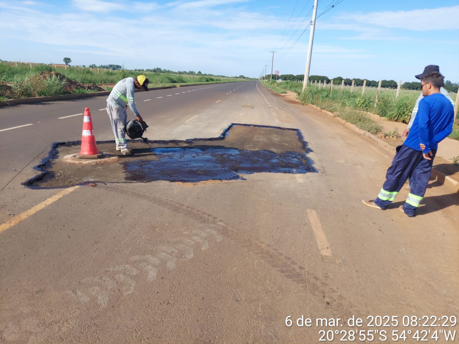 Na tarde desta segunda-feira (3), em meio ao feriadão de órgãos públicos, funcionários de uma empresa privada refaziam trecho do pavimento que estava se esfarelando. O defeito apareceu em um local em que a água ficava acumulada sobre a pista.