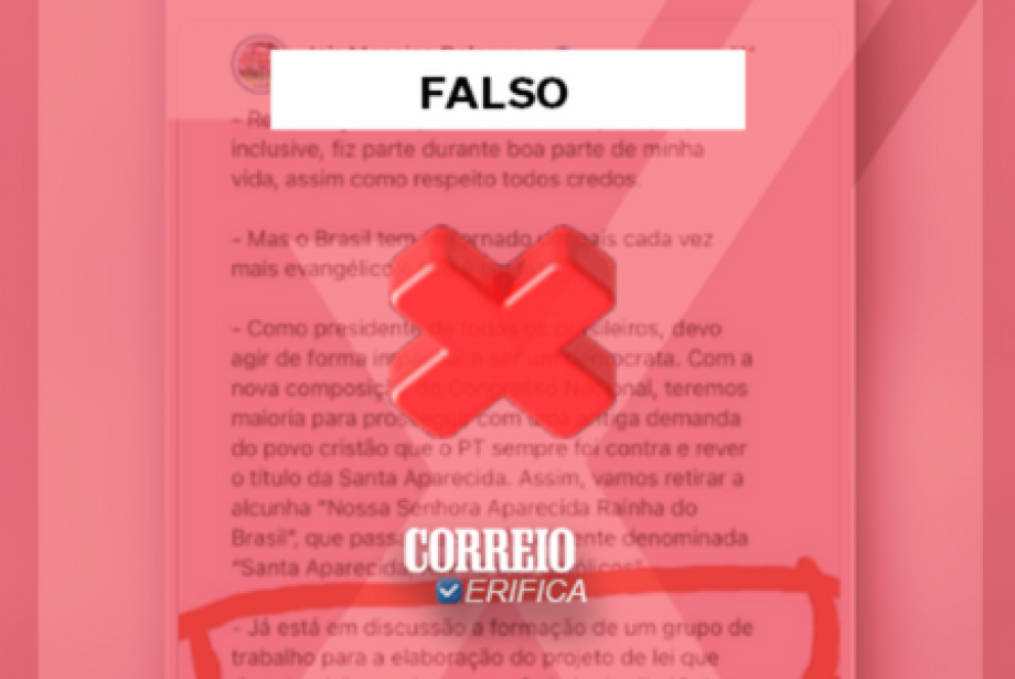 - Conteúdo investigado: Tuíte exibe captura de tela do que seria uma postagem feita pelo presidente Jair Bolsonaro (PL) no Facebook. Nela, o presidente diz reconhecer e respeitar a fé católica, mas pondera que o Brasil tem se tornado um país cada vez mais evangélico e cita um suposto clamor desses fiéis para retirar a alcunha de “Nossa Senhora Aparecida Rainha do Brasil”, passando a denominá-la “Santa Aparecida, Rainha dos Católicos”. A publicação assinala em vermelho um trecho em que Bolsonaro teria apontado a formação de um grupo de trabalho para elaboração de um projeto de lei acabando com o feriado de 12 de outubro, a partir de 2023.