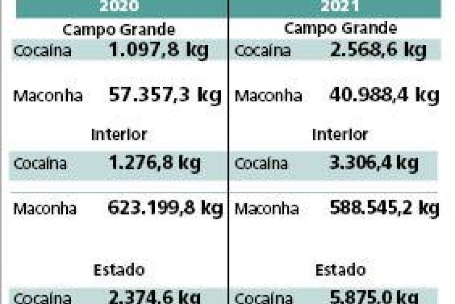 A apreensão de cocaína pelas forças policiais ligadas a Secretaria de Estado de Justiça e de Segurança Pública (Sejusp) mais que dobrou em 2021 em relação ao ano passado, tanto em Campo Grande, como em todo o Mato Grosso do Sul.