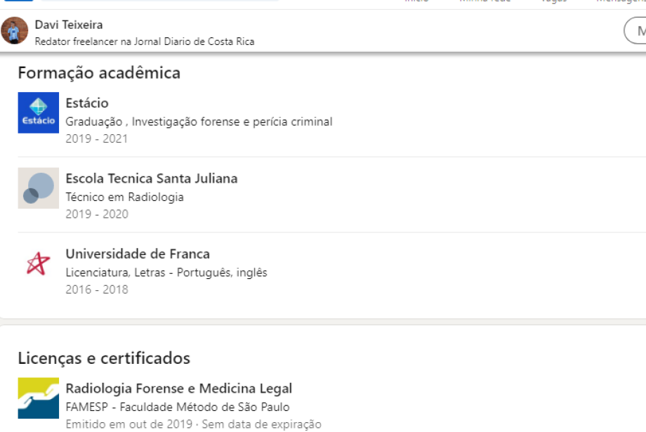Em seu Linkedin, consta que Davi seria Redator freelancer no Jornal Diário de Costa Rica. Por formações, consta graduações em: