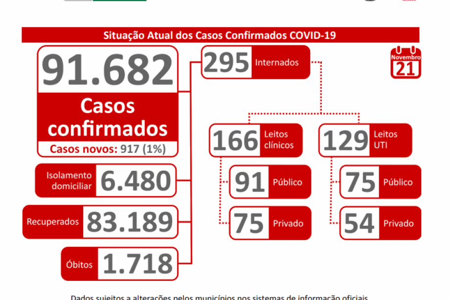 De acordo com a SES, em estágio de recuperação registram-se 6.480 pessoas em isolamento domiciliar, 295 estão internados entre leitos clínicos e Unidades de Tratamento Intensiva(UTI). No Estado 83.189 pessoas se recuperaram da doença.