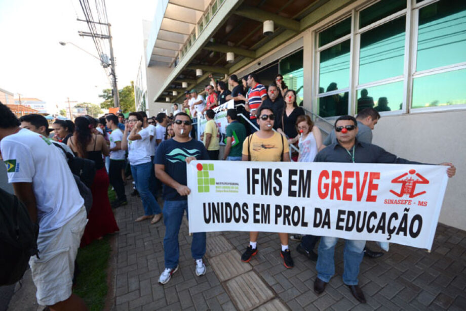 Em greve há 26 dias, os servidores do Instituto Federal de Mato Grosso do Sul (IFMS) protestam em frente à sede do campus, na Avenida Ceará, na manhã desta sexta-feira (7).